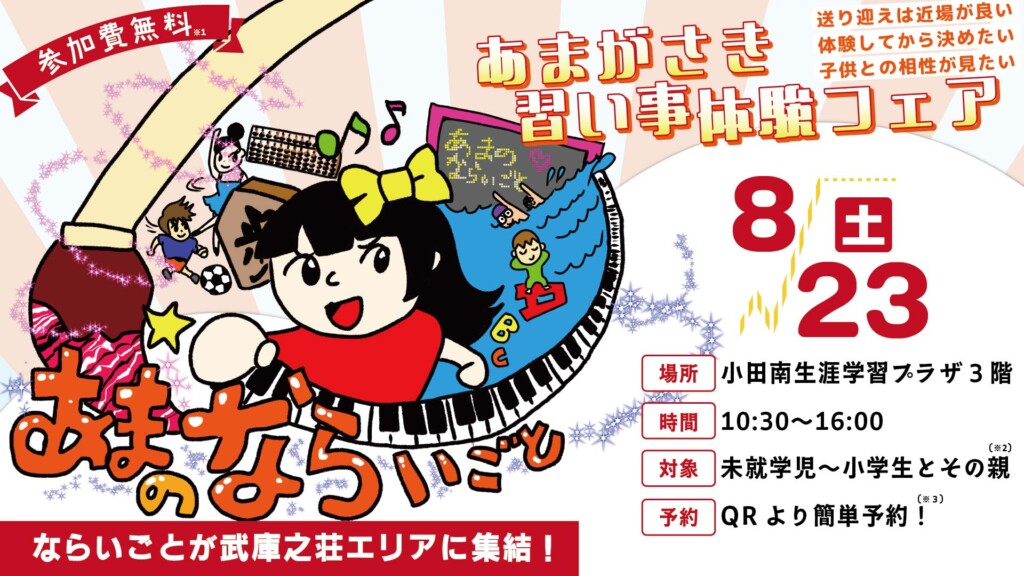 子どもたちが自分に合うならいごとを見つけられる、8月23日武庫西生涯学習プラザの『あまのならいごと』『未来の部活』に協賛してくださいました。