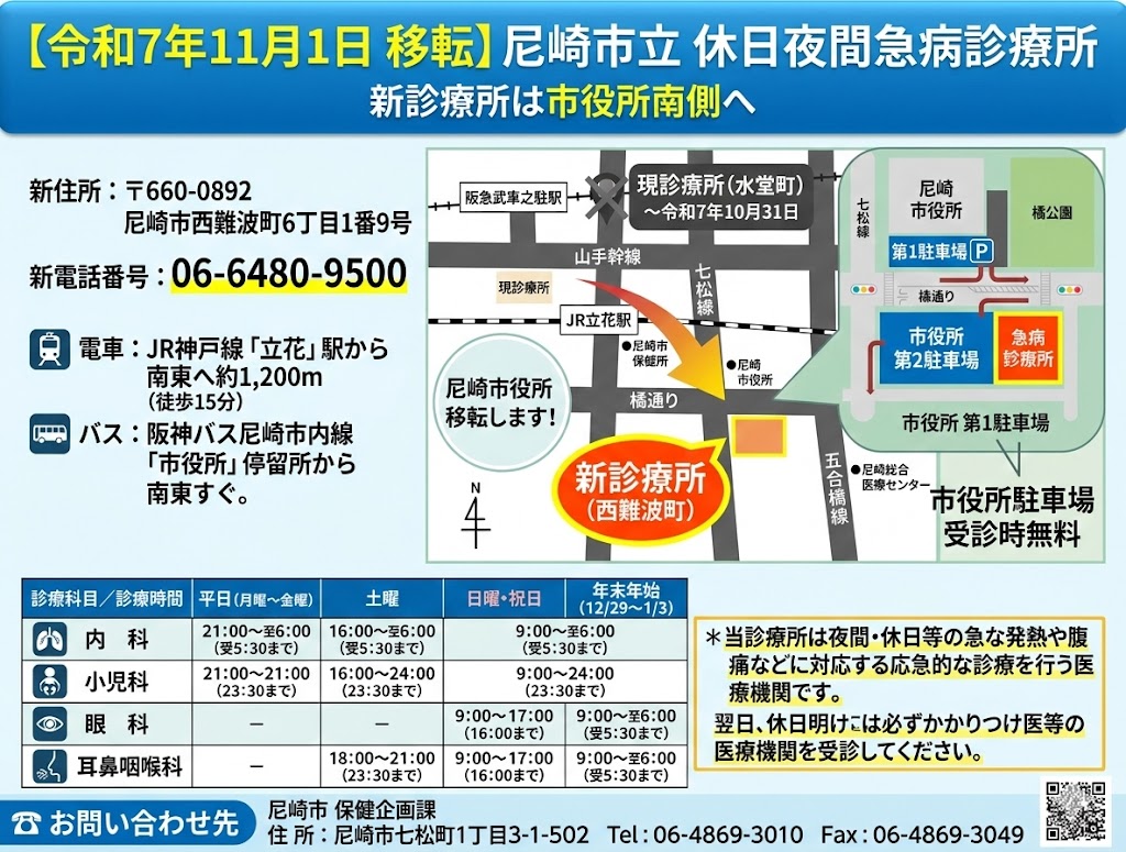 夜中の急病、場所を間違えないで!尼崎市休日夜間急病診療所が市役所近くへ移転オープンしてます。