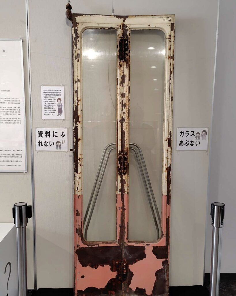 2026年3月3日から常設展示が開始されたのは、かつて阪神電鉄で活躍した「881形(881号車)」の貫通扉(かんつうとびら)です。この貴重な資料は、西宮市在住の小笠原裕一氏より寄贈されたもので、車両同士をつなぐ連結部分に使用されていた本物の扉だそうです!