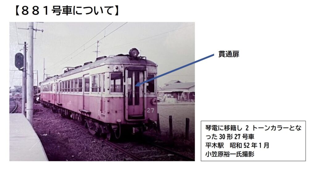 戦前の阪神電鉄において最後に新しく作られた車両で、連結面に設けられた「2枚折戸」の貫通扉がデザイン上の大きな特徴です。阪神本線や武庫川線で多くの尼崎市民を運んだあと、1967年(昭和42年)には香川県の高松琴平電気鉄道(ことでん)へ譲渡され、1977年(昭和52年)に引退するまで長く愛され続けたそうですね。