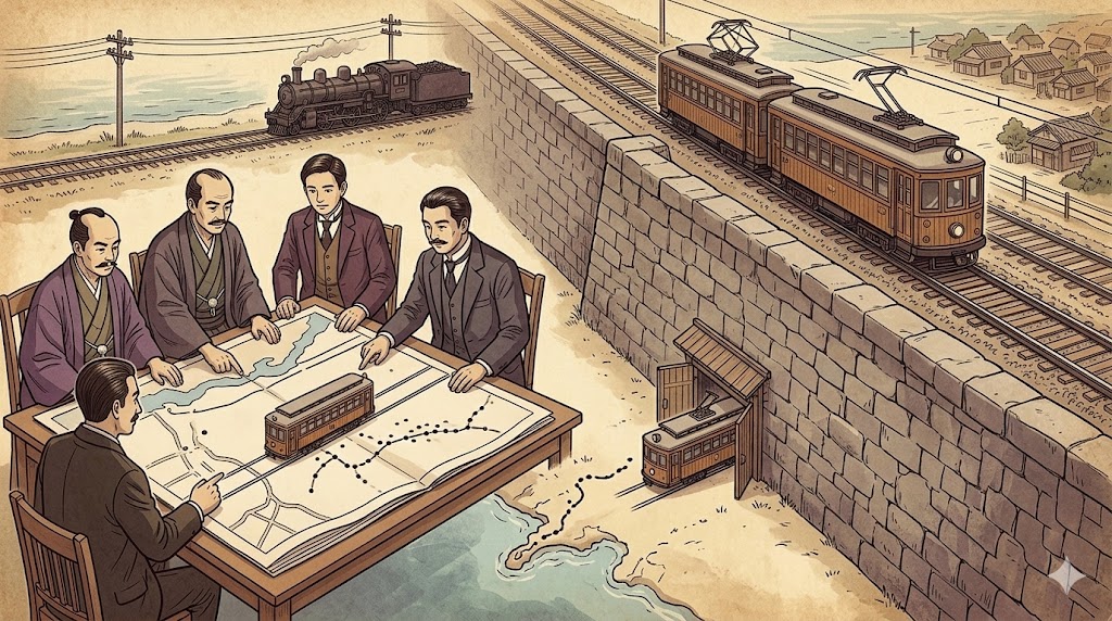 路面電車という名目で認可を得ることで法律の壁をうまく乗り越えつつ、実際にはその大部分を専用の線路にし、高速運転を行うという、アメリカ流のインターアーバン形式を日本で初めて実現させたのです。