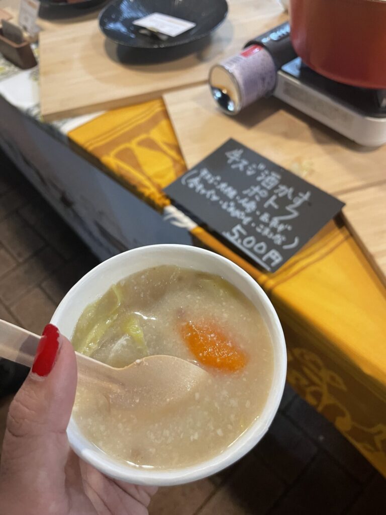 出屋敷近くに店を構えるガサキックスラボでは、酒粕の入ったポトフをいただきました。酒粕特有の臭みは一切なく、非常に丁寧に調理されていることが伝わる優しい味わいです。冷え込む夜の屋外イベントにおいて、体の芯から温まる一杯でした。