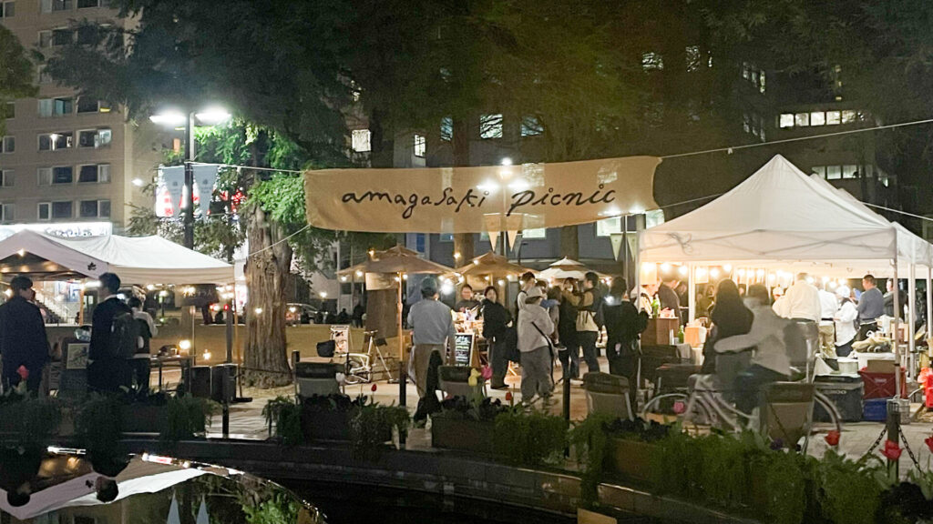 阪神尼崎駅前の日常を彩るイベント「amagasaki picnic」。その中でも夜の時間帯をゆったりと楽しむ「ナイトアーバンテラス」が、2026年4月8日に開催されました。今年度からは会場を中央公園の1階芝生広場へと移し、より開放的な空間でのスタートとなりました。